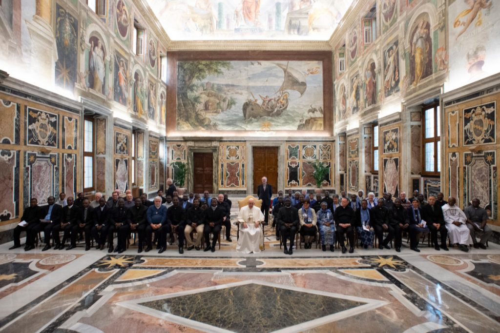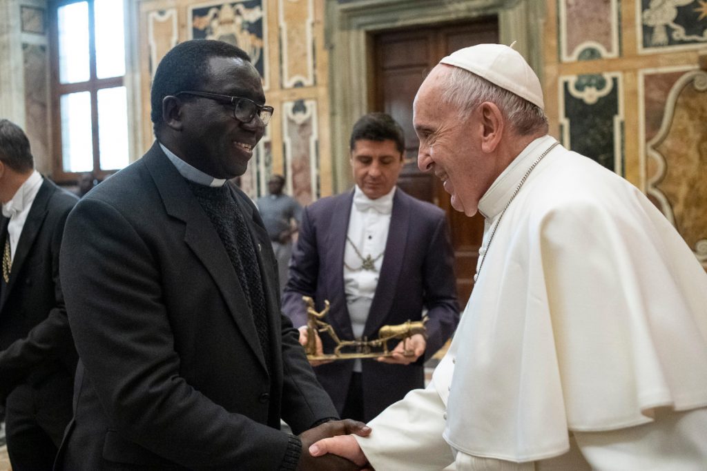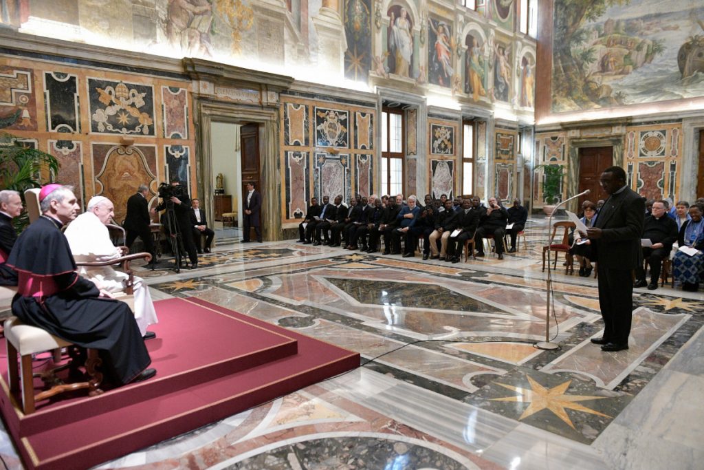 Audience privé avec le Pape – suite et fin Posted on 11/02/2019 by Vitus Danaa AboboPendant l’audience, je n’étais autorisé à prendre des photos qu’à partir de ma place. Je n’ai donc pas pu prendre de photo de notre groupe pendant l’audience. En voici trois officielles, pour lesquelles nous avons acheté les droits de publications :Voici la photo du mot de remerciement de notre supérieur général Stan Lubungo.La poignée de mains du Pape François avec notre Supérieur Général :Et la photo de groupe :© Servizio Fotografico – Vatican MediaRelated Posts:Le déclin de la fraternité humaine: Violations des…Défendre les droits de l'homme face à l'exploitation…Vivre le célibat avec intégrité (réservé aux Miss.…Lettre pastorale de Mgr Desfarges, Archevêque d'AlgerTurbulence et Re-définition dans la Société,…Formation dans la Société (PE n° 1087 - 2018/01)
