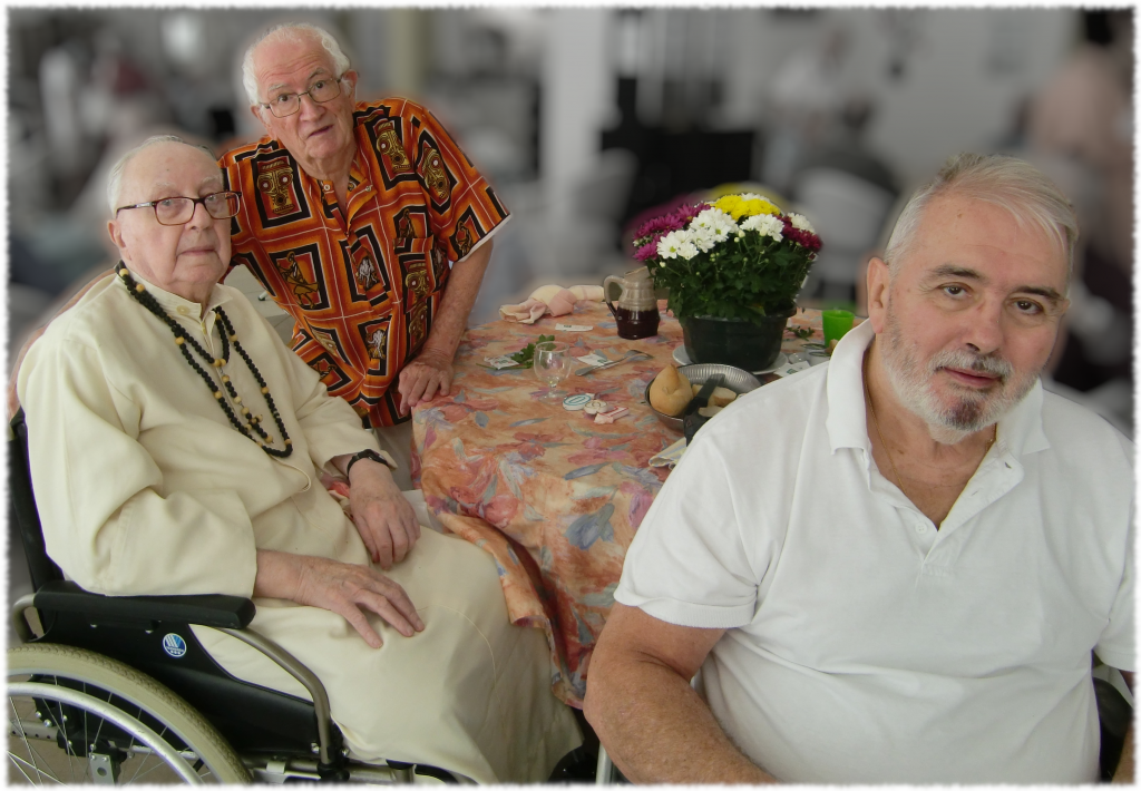 Fr. Patrick Bataille was able to come for a few days and it is he who presides over the Eucharistic celebration. Jean is seated next to Sister Emmanuelle who is 102 years old. It is Jean who will read the Gospel (Mt 18, 2-5), while Fr. Jean-Marie Vasseur will give the homily to thank the Lord for the call of our confrere. At the end of the celebration, M. Poumeyrol, a retired army colonel, will come to remind us of John’s commitment during the last war which took him from Corsica to Mont Cassino, to Marseille and as far as Alsace… he gave him the book ” Promotion Corse et Provence 1964-66 de l’école militaire de St Cyr “. Mrs Cathy Roques, the deputy director, will come to say all her wishes to our centenary in the name of all the staff by inviting us to come to the dining room for a big festive meal finished with champagne, the real thing !
