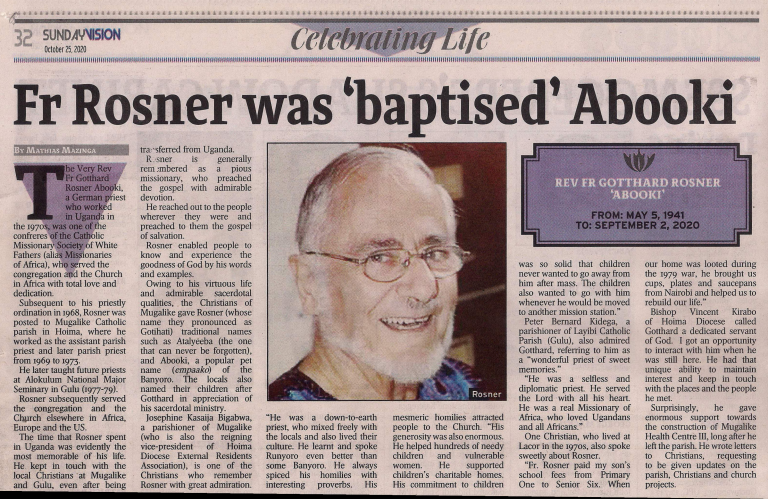 Le Père Rosner, “baptisé” Abooki Posted on 25/10/2020 by Vitus Danaa AboboLe Père Rosner, 'baptisé' AbookiPar Matthias MazingaDans sa rubrique « Célébrons la Vie » du dimanche 25 octobre 2020, le premier quotidien ougandais “New Vision” a publié, sous la plume de son journaliste Matthias Mazinga, un hommage en l’honneur de notre confrère le Père Gotthard Rosner, décédé le 2 septembre dernier. Merci à Otto Katto pour nous en avoir envoyé la copie.Rev. P. Gotthard Rosner‘Abooki’Du : 5 mai 1941Au : 2 septembre 2020 Le révérend père Gotthard Rosner Abooki, en Ouganda dans les années 1970, était l’un des confrères de la Société Catholique Missionnaire des Pères Blancs (alias Missionnaires d’Afrique), qui a servi la congrégation et l’Eglise en Afrique avec un amour et un dévouement total.Après son ordination sacerdotale en 1968, Rosner a été affecté à la paroisse catholique de Mugalike à Hoima, où il a travaillé en tant que vicaire puis curé de 1969 à 1973. Il a ensuite enseigné aux futurs prêtres au grand séminaire national d’Alokulum à Gulu (1977-79). Rosner a ensuite servi la congrégation et l’Église ailleurs en Afrique, en Europe et aux États-Unis.Le temps que Rosner a passé en Ouganda a été de toute évidence le plus mémorable de sa vie. Il est resté en contact avec les chrétiens de la région de Mugalike et de Gulu, même après avoir été déplacé d’Ouganda. On se souvient généralement de Rosner comme d’un missionnaire pieux, qui prêchait l’évangile avec une admirable dévotion. Il a touché les gens partout où ils se trouvaient et leur a prêché l’évangile du salut. Rosner a permis aux gens de connaître et d’expérimenter la bonté de Dieu au travers de ses paroles et de son exemple.En raison de sa vie vertueuse et de ses admirables qualités de prêtre, les chrétiens de Mugalike ont donné à Rosner (dont ils prononçaient le nom Gotihati) des noms traditionnels tels que Atalyeeba (celui qui ne pourra jamais être oublié), et Abooki, un nom d’animal de compagnie populaire (empaako) des Banyoro. Les habitants ont également donné à leurs enfants le nom de Gothard en reconnaissance de son ministère sacerdotal.Josephine Kasaija Bigabwa, une paroissienne de Mugalike (qui est également la vice-présidente en exercice de l’Association des résidents extérieurs du diocèse de Hoima), est l’une des chrétiennes qui se souvient de Rosner avec beaucoup d’admiration. “C’était un prêtre terre-à-terre, qui se mêlait volontiers aux habitants et vivait aussi leur culture. Il a appris et parlé le runyoro encore mieux que certains banyoros. Il pimentait toujours ses homélies avec des proverbes intéressants. Ses homélies fascinantes attiraient les gens à l’Église. Sa générosité est aussi considérable. Il a aidé des centaines d’enfants nécessiteux et de femmes vulnérables. Il a soutenu des maisons de bienfaisance pour enfants. Son engagement en faveur des enfants était si solide que ceux-ci ne voulaient jamais le quitter après la messe. Les enfants voulaient aussi l’accompagner chaque fois qu’il était déplacé vers un autre poste de mission”.Peter Bernard Kidega, un membre de la paroisse catholique de Layibi (Gulu), admirait également le Gothard, le qualifiant de “merveilleux prêtre dont on garde de doux souvenirs”. C’était un prêtre désintéressé et diplomate. Il servait le Seigneur de tout son cœur. C’était un vrai missionnaire de l’Afrique, qui aimait les Ougandais et tous les Africains”.Un chrétien, qui a vécu au Lacor dans les années 1970, a également parlé avec gentillesse de Rosner. “Le père Rosner a payé les frais de scolarité de mon fils de la première année primaire à la sixième année secondaire. Lorsque notre maison a été pillée pendant la guerre de 1979, il nous a apporté des tasses, des assiettes et des casseroles de Nairobi et nous a aidés à reconstruire notre vie”.L’évêque Vincent Kirabo du diocèse de Hoima a qualifié le Gothard de serviteur dévoué de Dieu. “J’ai eu l’occasion de collaborer avec lui lorsqu’il était encore ici. Il avait cette capacité unique de garder l’intérêt et de rester en contact avec les lieux et les personnes qu’il rencontrait”.Contre toute attente, il a apporté un soutien énorme à la construction du centre de santé Mugalike III, longtemps après avoir quitté la paroisse. Il a écrit des lettres aux chrétiens, demandant à être informé des dernières nouvelles concernant la paroisse, les chrétiens et les projets de l’église.