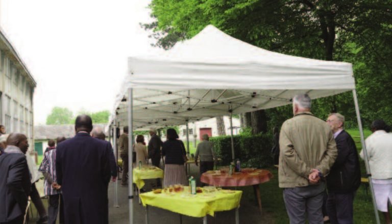 The 150th Anniversary Jubilee, organized by the AAPB (Association of the White Fathers’ Friends) of Paris and the Missionaries of Africa of MOURS, was celebrated on Sunday, May 19th. Yves has participated in several preparatory meetings in Paris and Mours. Jean-Louis prepared the park’s walkways to allow visitors to get some fresh air and planned for the lawns to be able to accommodate the 150 people invited for the day. Jean for weeks had been preparing an exhibition to present the Missionaries of Africa and MSOLA and renovated the glass roof space to install the panels brought by Bernard Lefebvre. Everyone on their own side had their hands in the game so that everything could go well. Everything was planned for us to live this day in the heart of nature: mass, conferences, aperitif and meal on the lawn and under the lime trees… But the weather changed our plans at the last minute and the day before we decided to review the program of installation of the festivities!